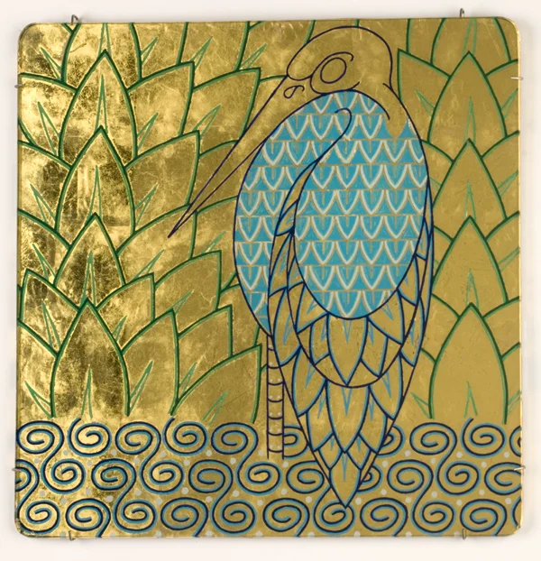 Oil paint, tinted varnish, 22 karat gold leaf and gilders silver on glass